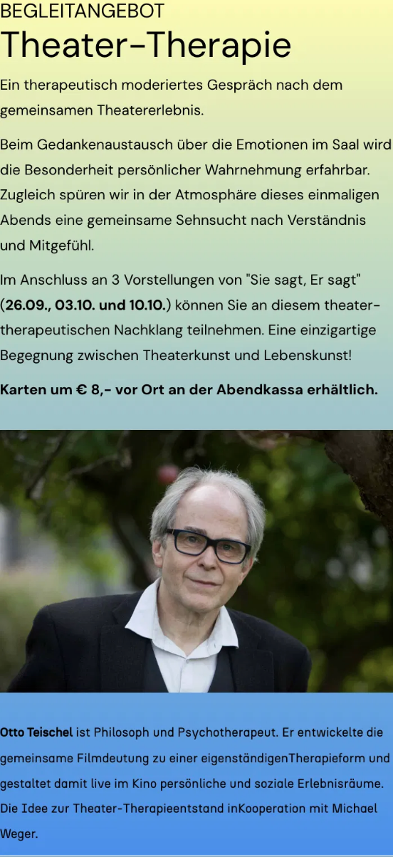 Neben der Filmtherapie im Kino wird es an drei Freitagen zu Beginn der neuen Spielzeit in der neuen bühne villach erstmals auch eine Theatertherapie geben!